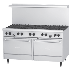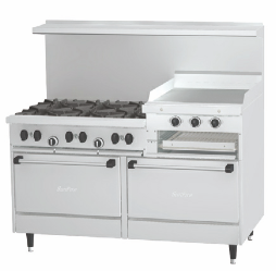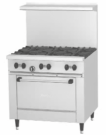 Cocina industrial marca US. Range características: acero inoxidable en frente y laterales, acero inoxidable de 4'' de espesor, respaldar removible en acero inoxidable, dos secciones de bandejas para limpieza de desperdicios, Quemadores de 30.000BTU circulares, 18000BTU en quemador tipo H, horno de 33.000BTU cubierto en paredes de porcelana, termostato hasta 260ºC